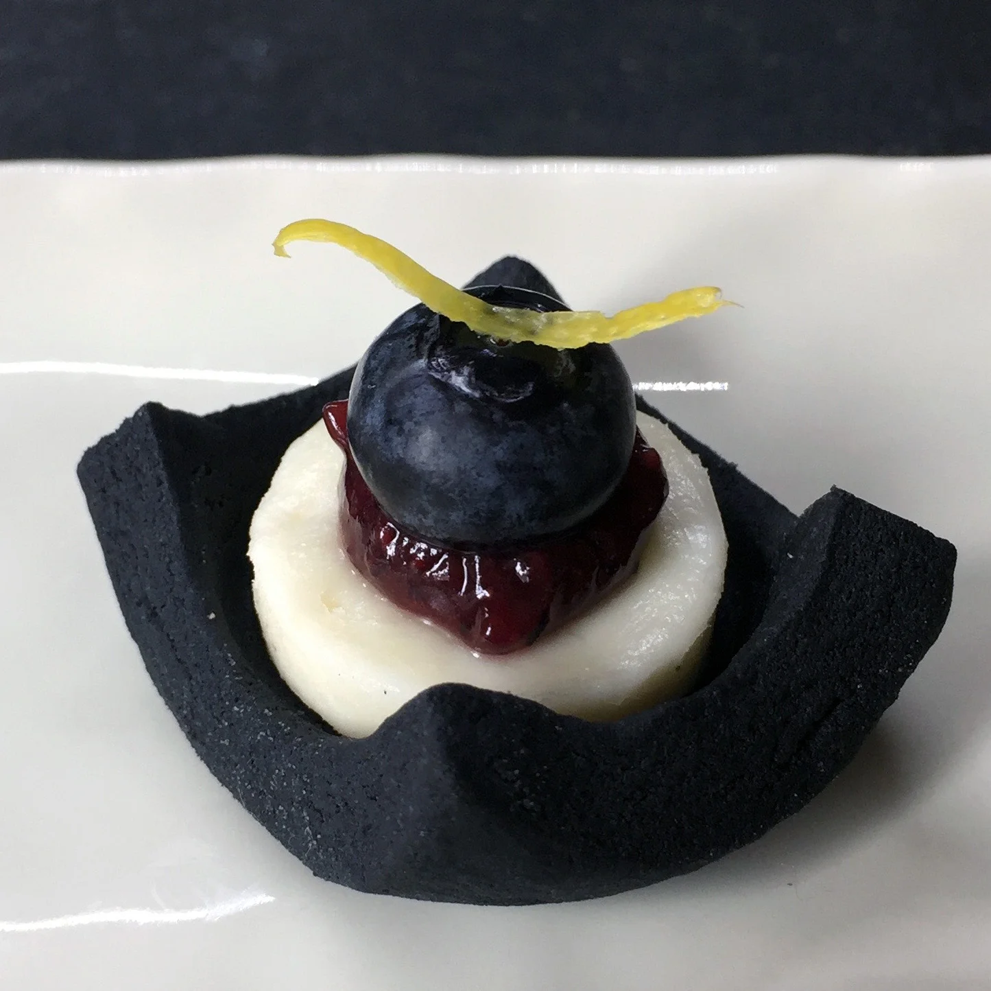 Charcoal biscuit with taleggio cheese, quince & blueberry paste, pickled blueberry and lemon zest garnish.