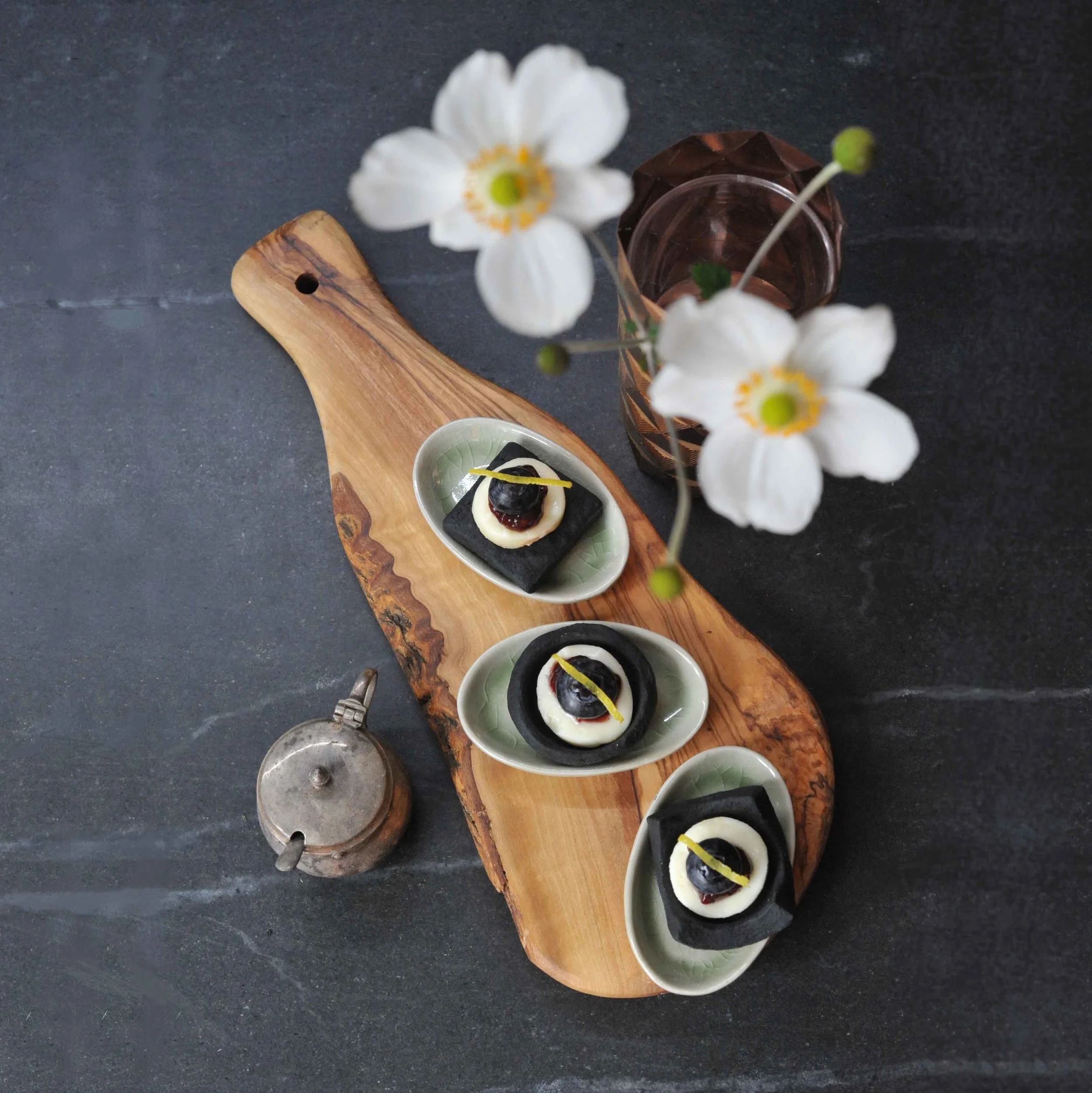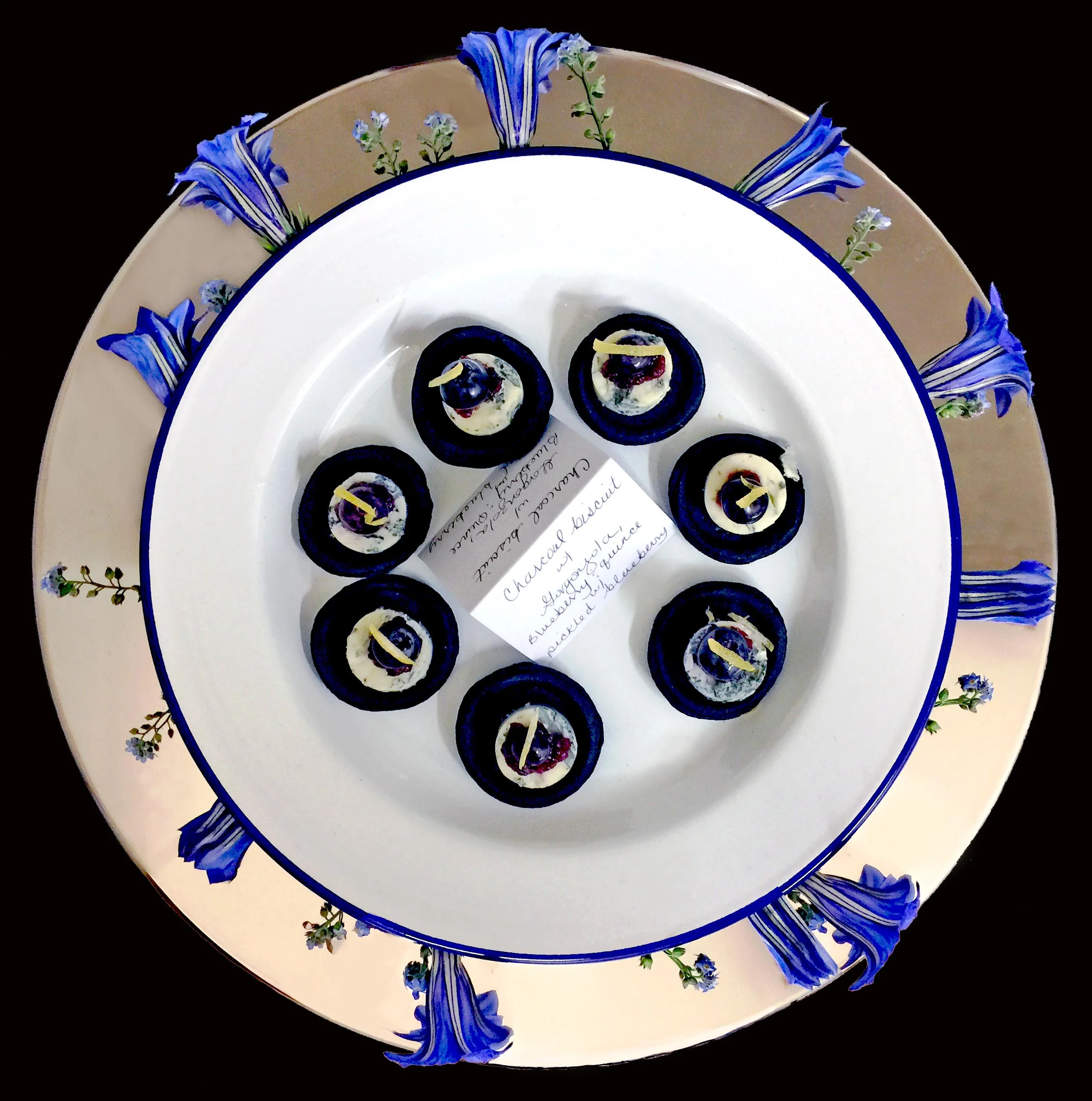 Tray of charcoal biscuit canapés served on an enamel plate within a sterling silver inset plate and decorated with fresh forget-me-not and gentiana flowers.