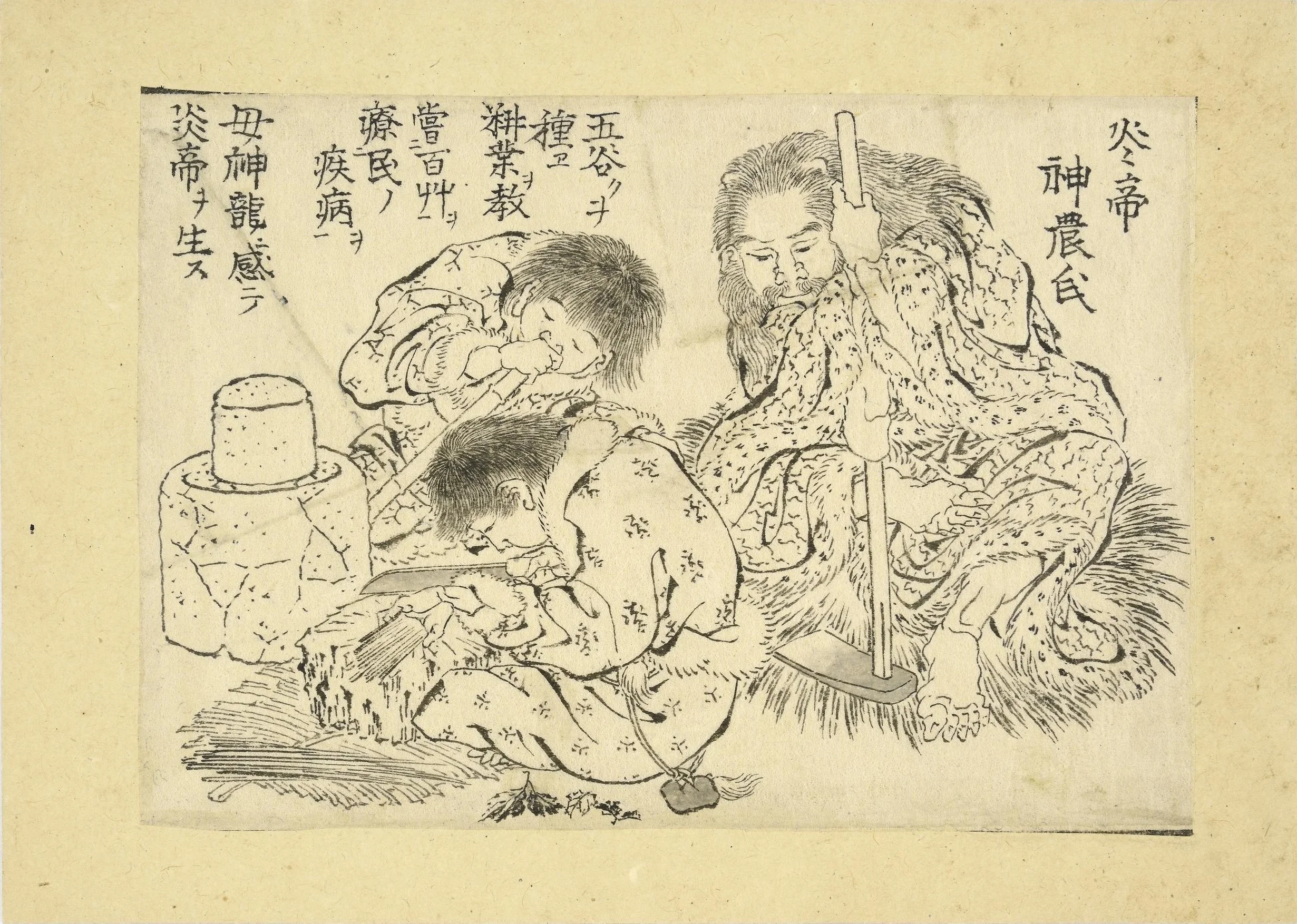 Illustration/drawing. The god of agriculture Shennong and two boys prepare herbal medicine from the Great Picture Book of Everything. Painted by: Katsushika Hokusai 葛飾北斎 1820s-1840s
