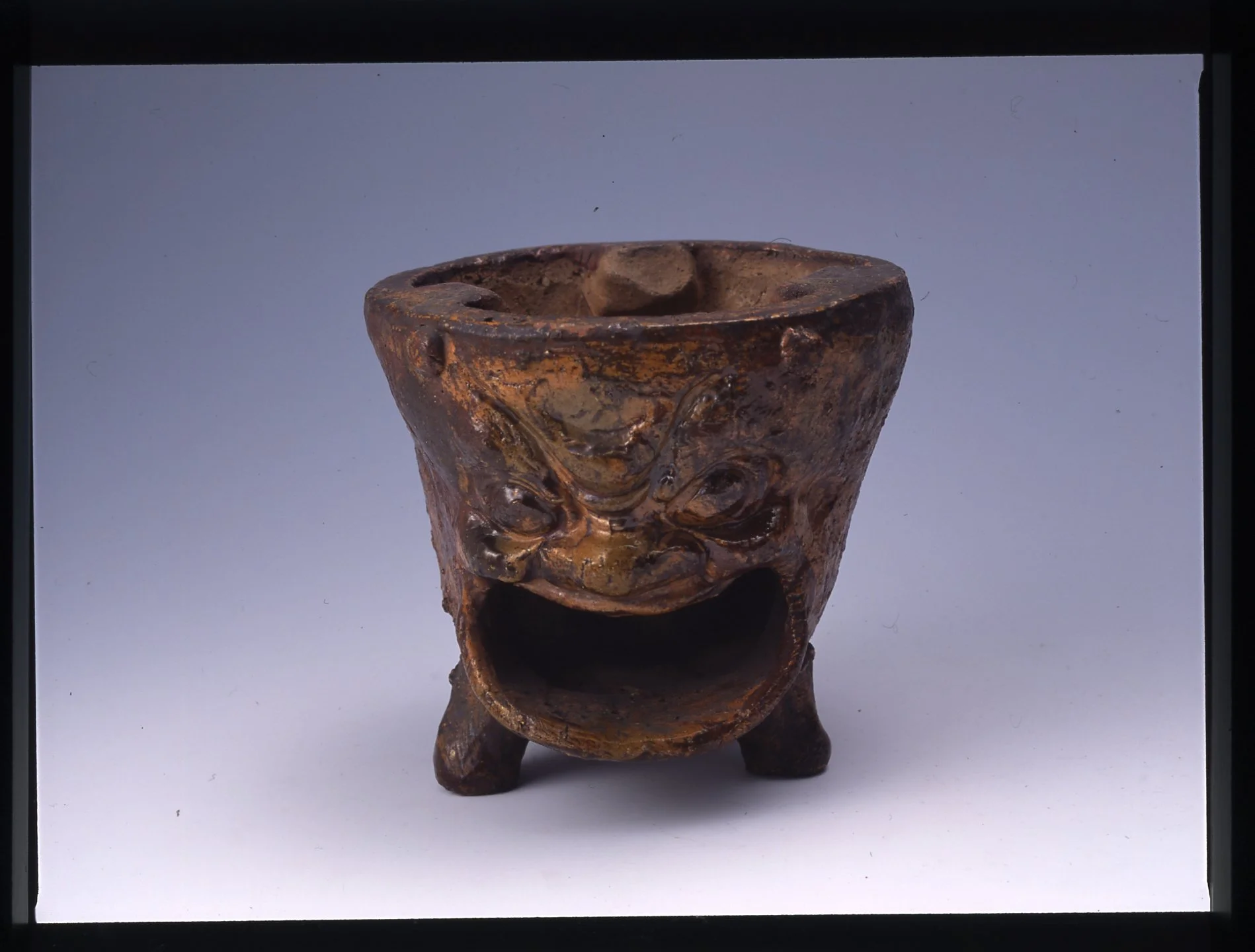 Tripod brazier for sencha teapot, in the form of a demon's head with wide mouth. Made of earthenware. 19th c