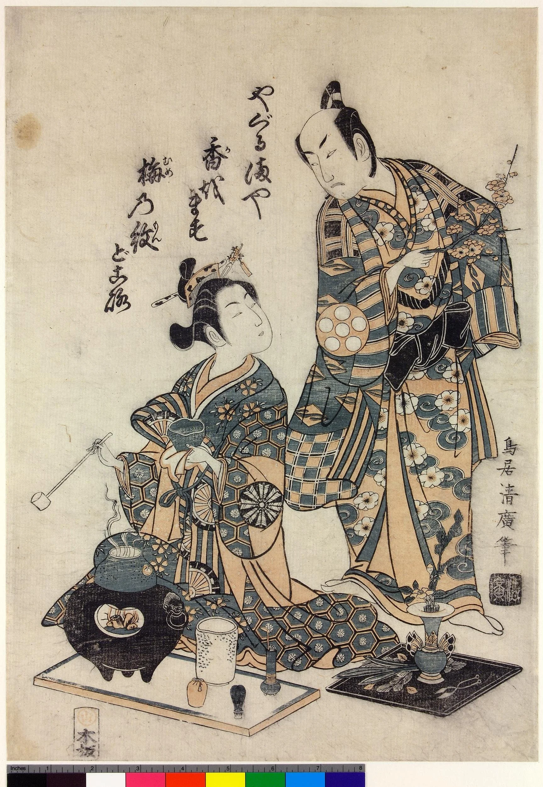 The Kabuki actors Yamashita Matataro I in role of samurai with plum blossom and Nakamura Tomijuro in role of prostitute kneeling and performing the tea ceremony. With poem. 1755